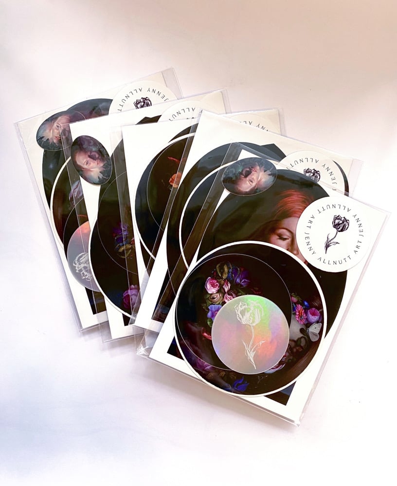 This collection features 5 vinyl stickers of various sizes, a postcard and small business card.